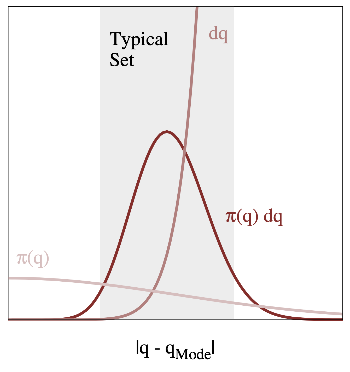 The typical set is the region where we have both high density and high volume. In high dimensions, it is crucial to think about volume, in that regions with high density don’t necessarily have high volume. In practice, we find the typical set with the sampling process that explores the parameter space.